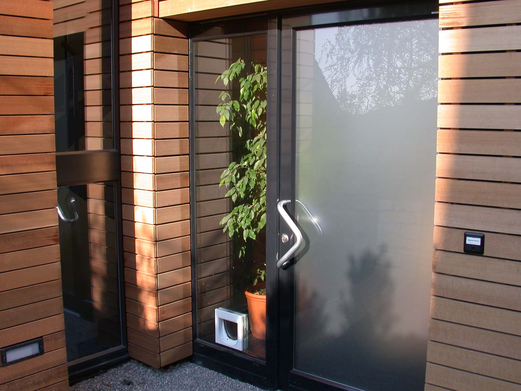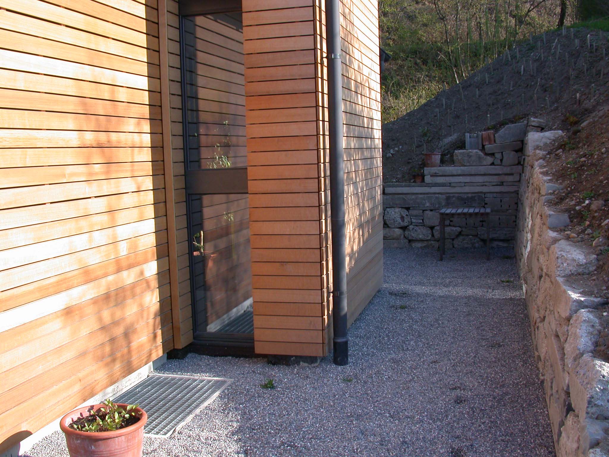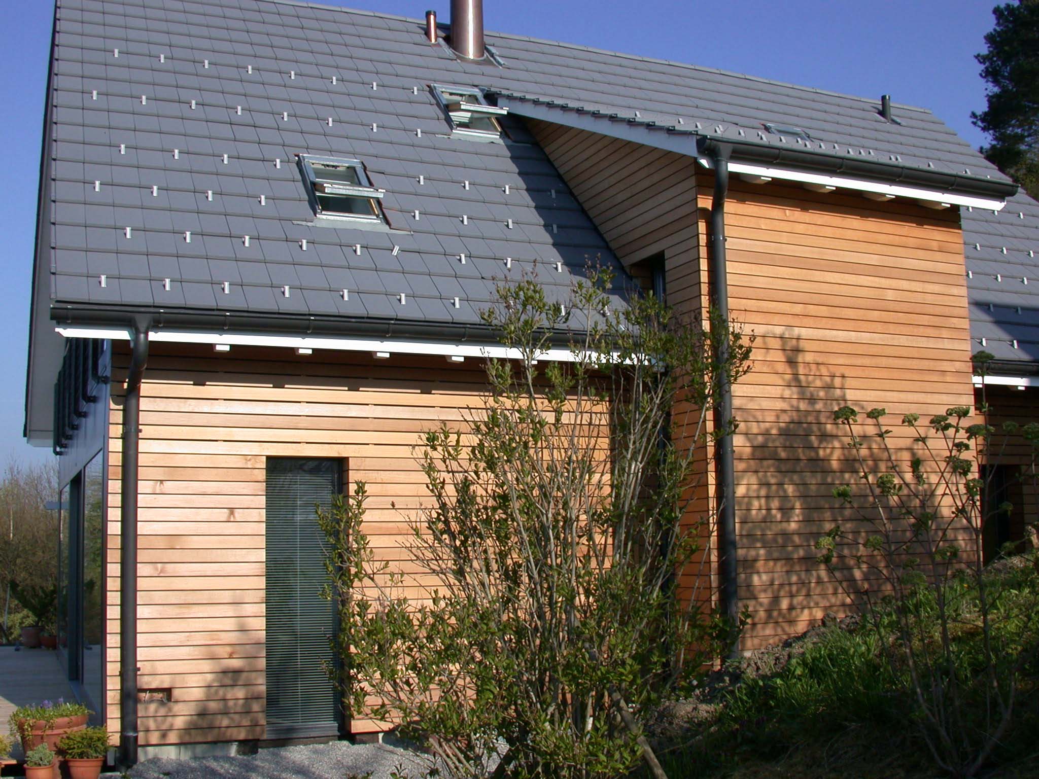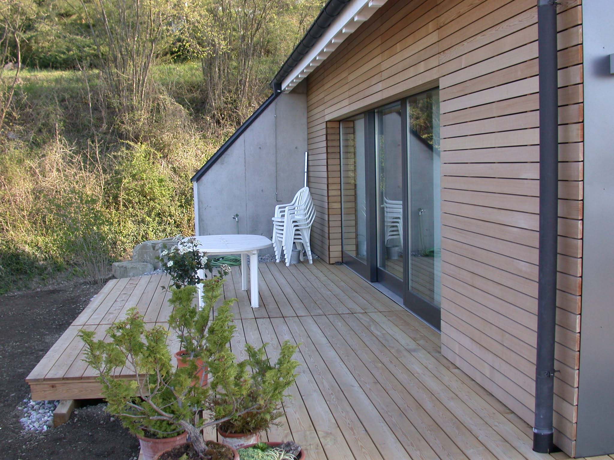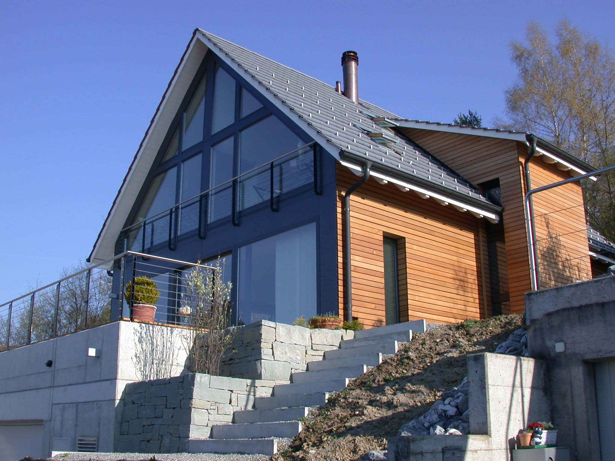 Lärchenstulpschalung auf Bricosolmauerwerk bei Ost- und Westfassade. Südfassade aus Fensterfront.