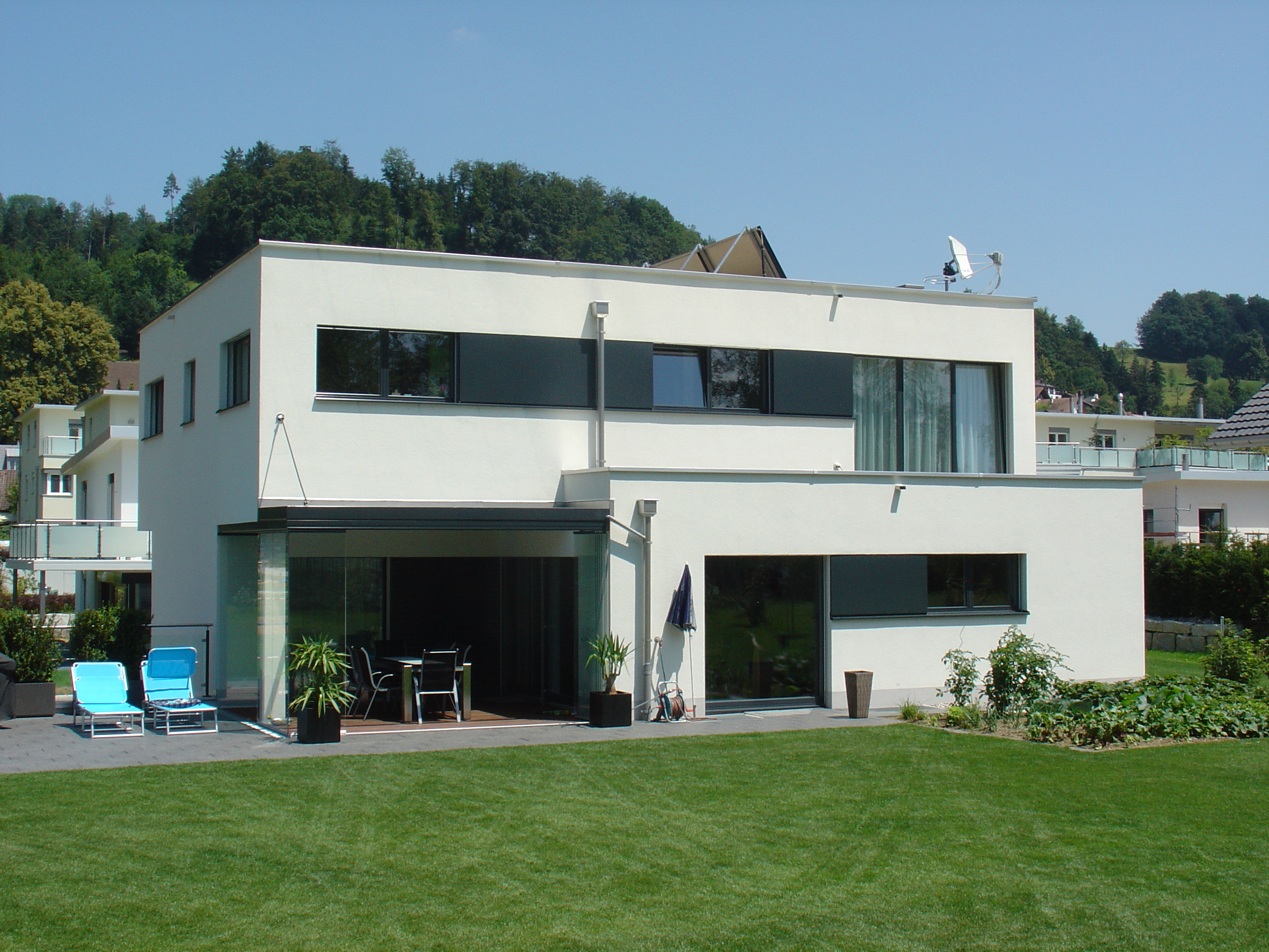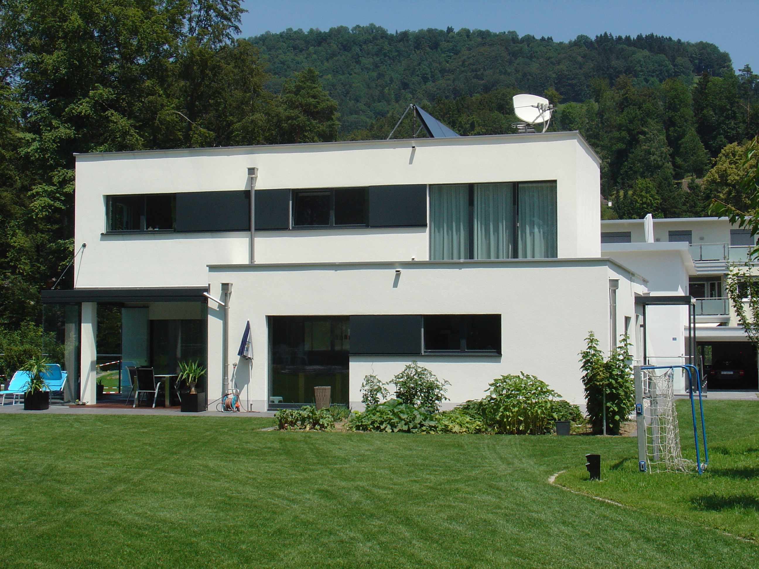 Untergeschoss, Erdgeschoss und Dachgeschoss. Flachdach mit extensiver Begrünung.
