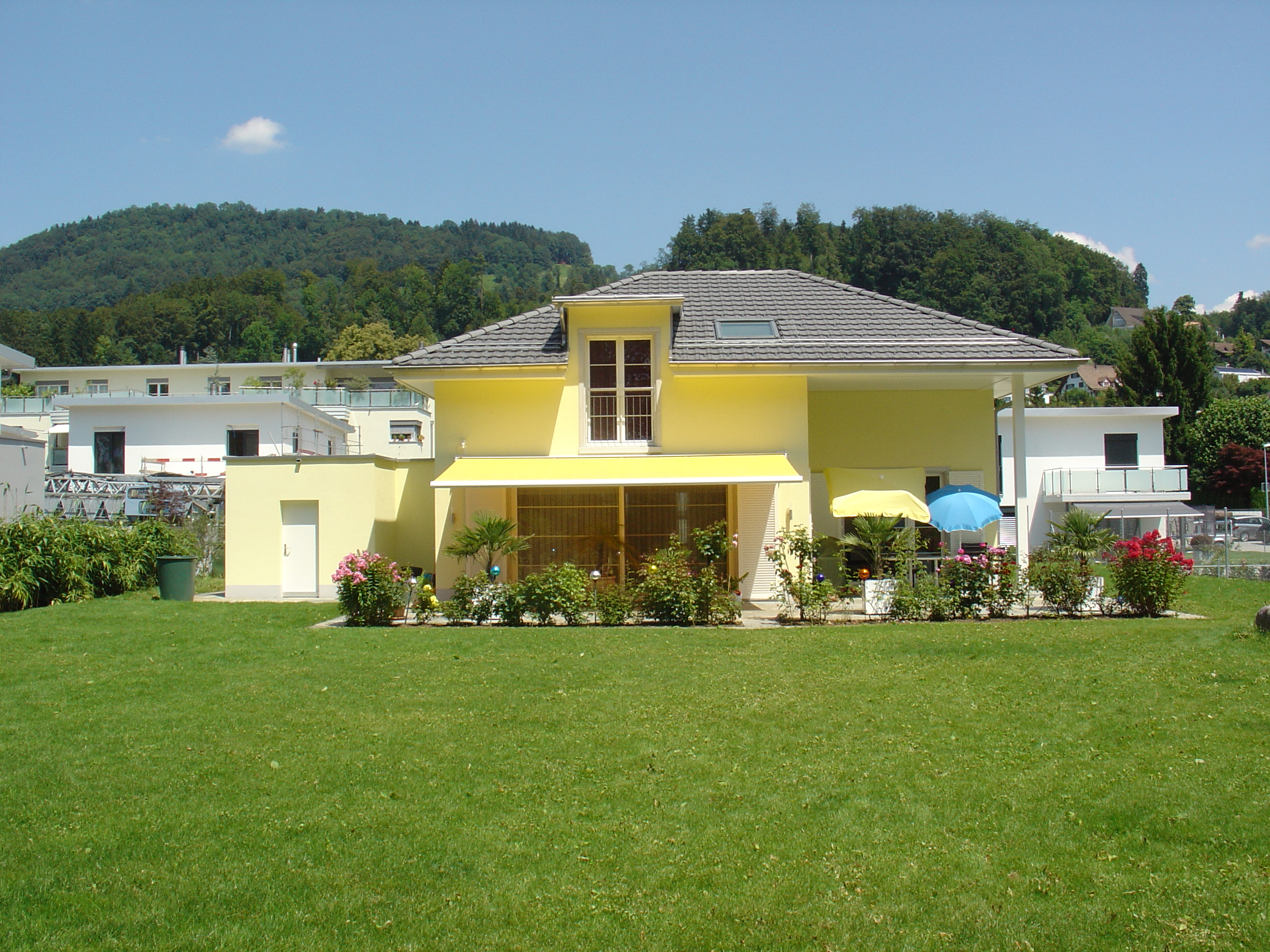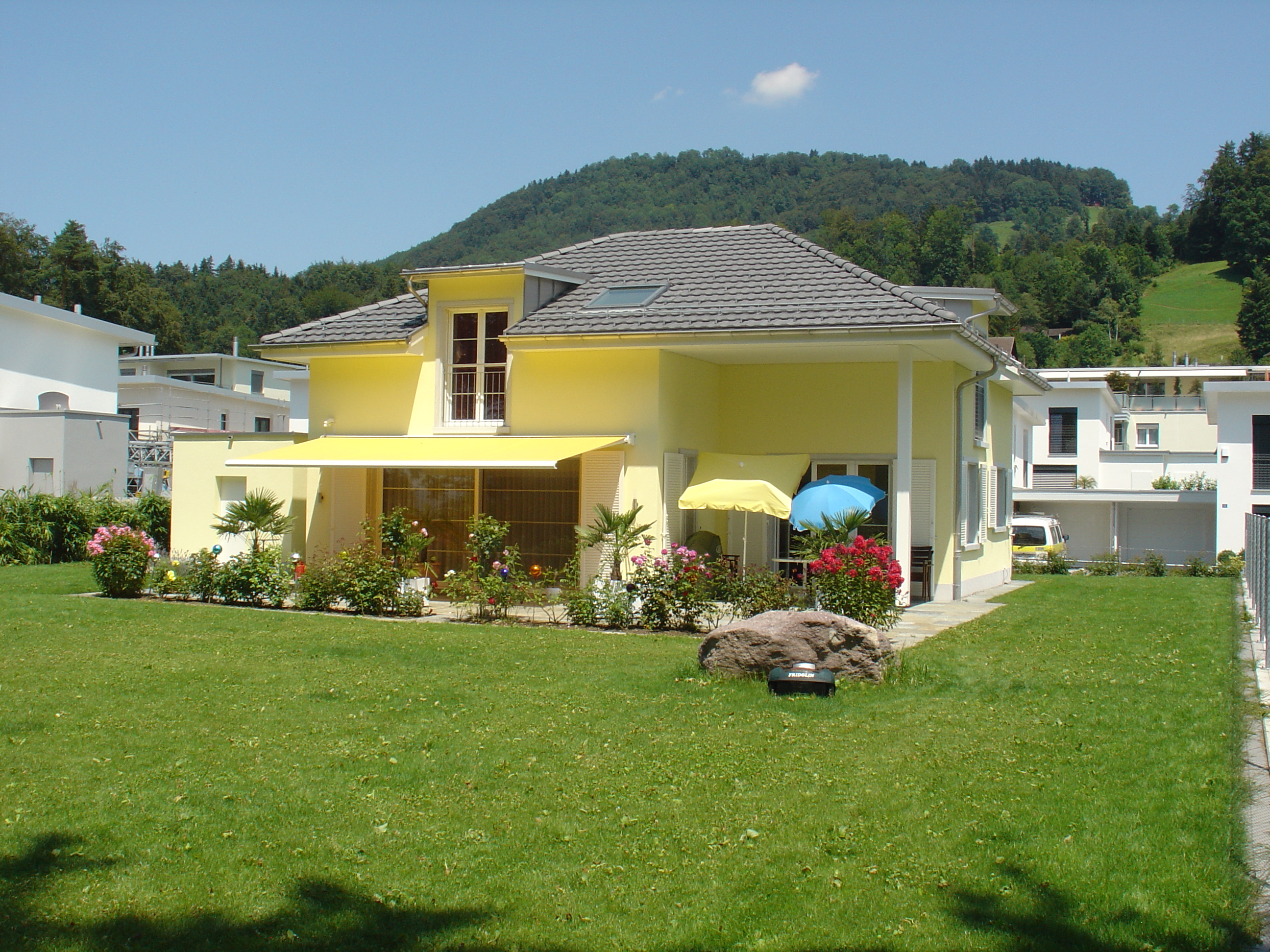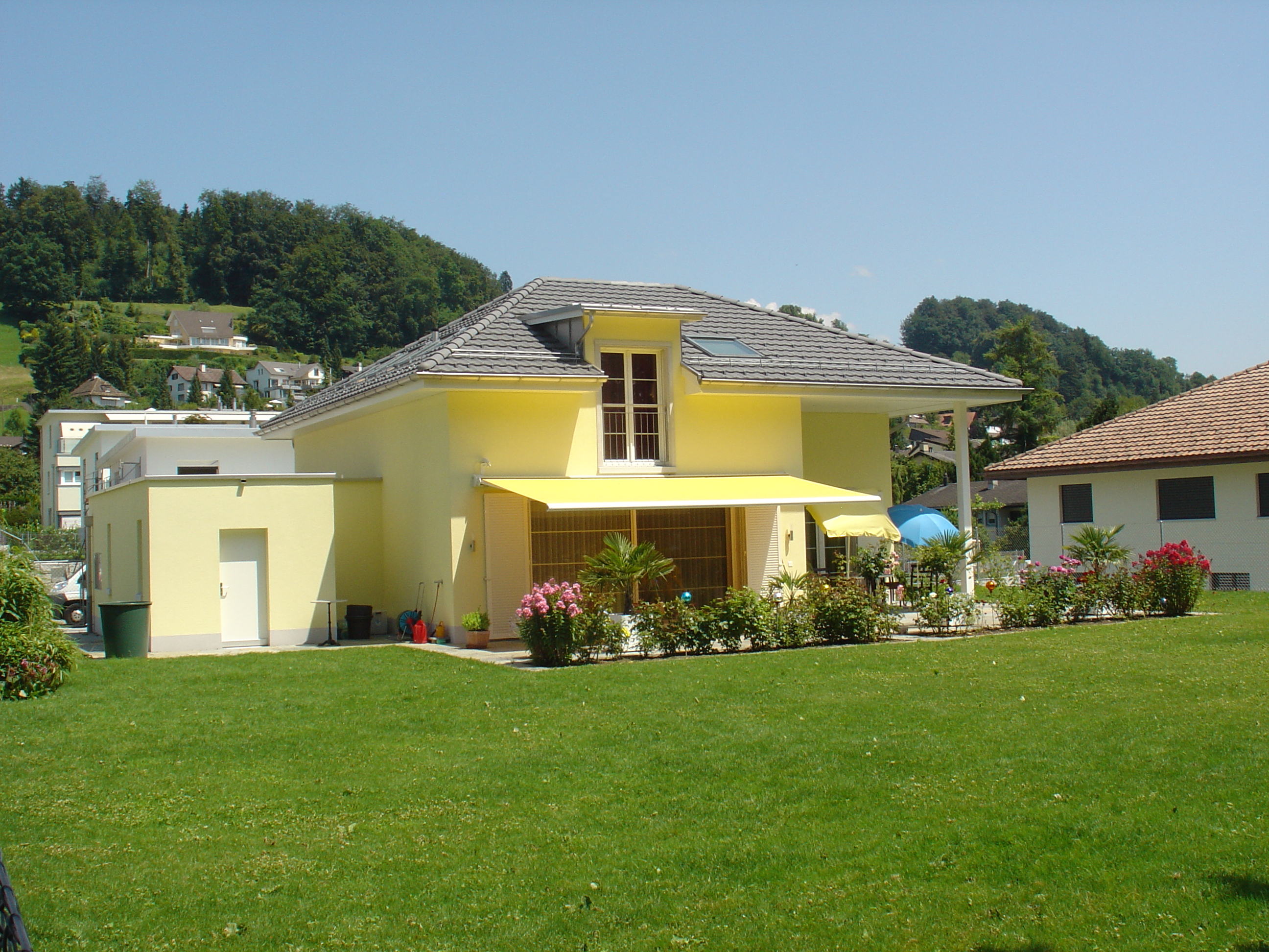 Untergeschoss, Erdgeschoss und Dachgeschoss. Walmdach mit Ziegeldeckung, Kunststofffenster.