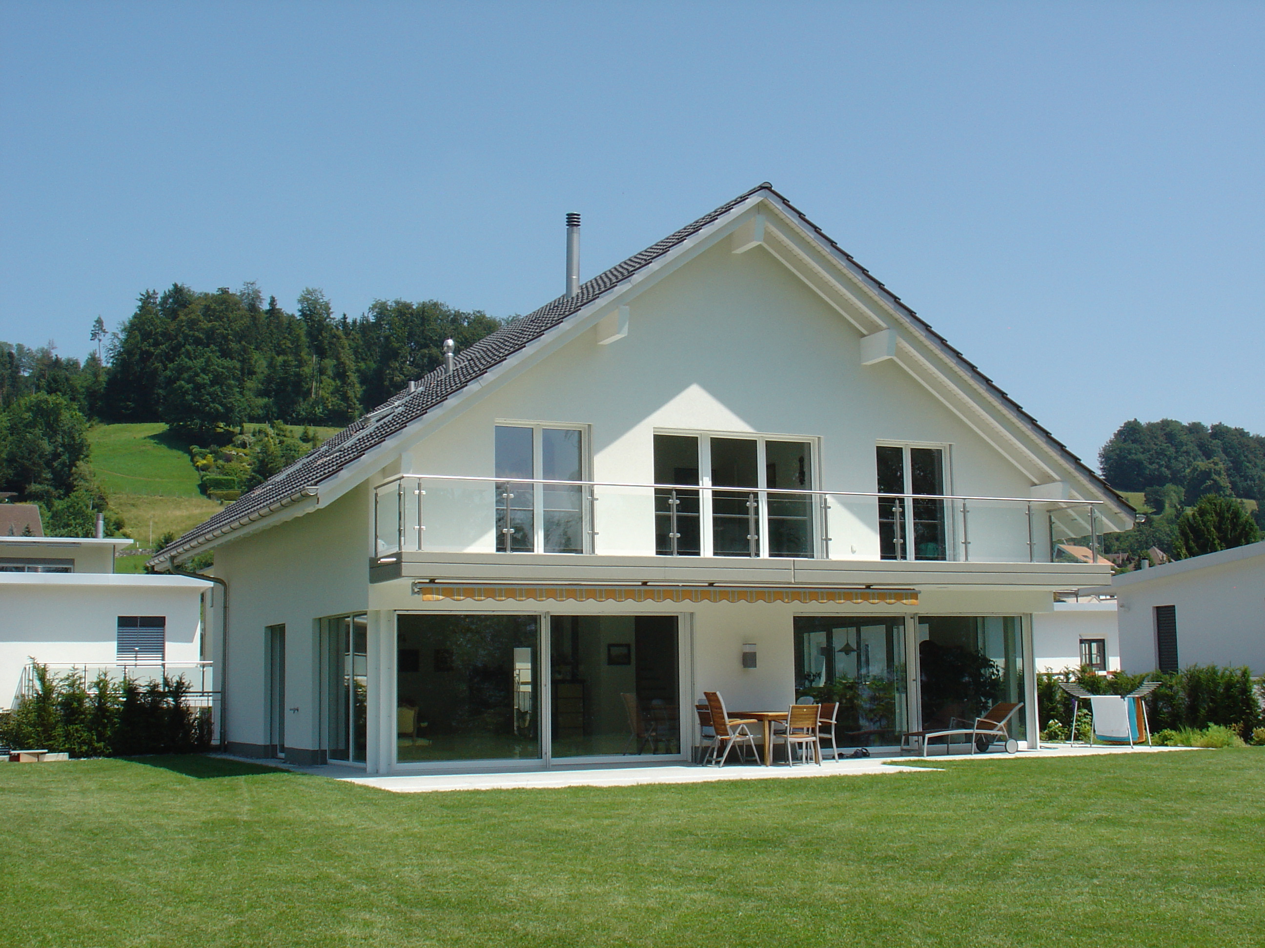 Untergeschoss, Erdgeschoss und Dachgeschoss. Satteldach mit Ziegeldeckung, Kunststofffenster.