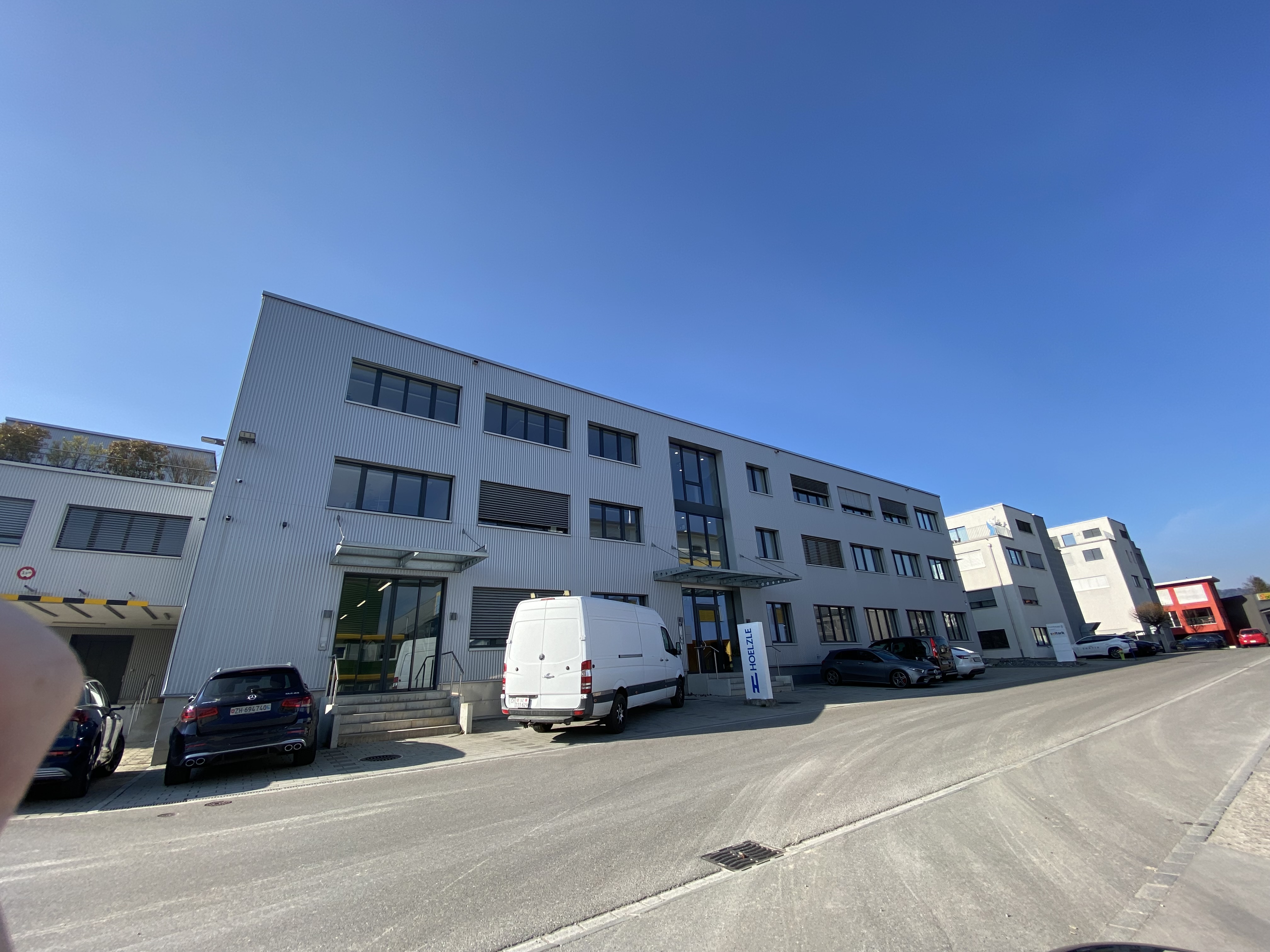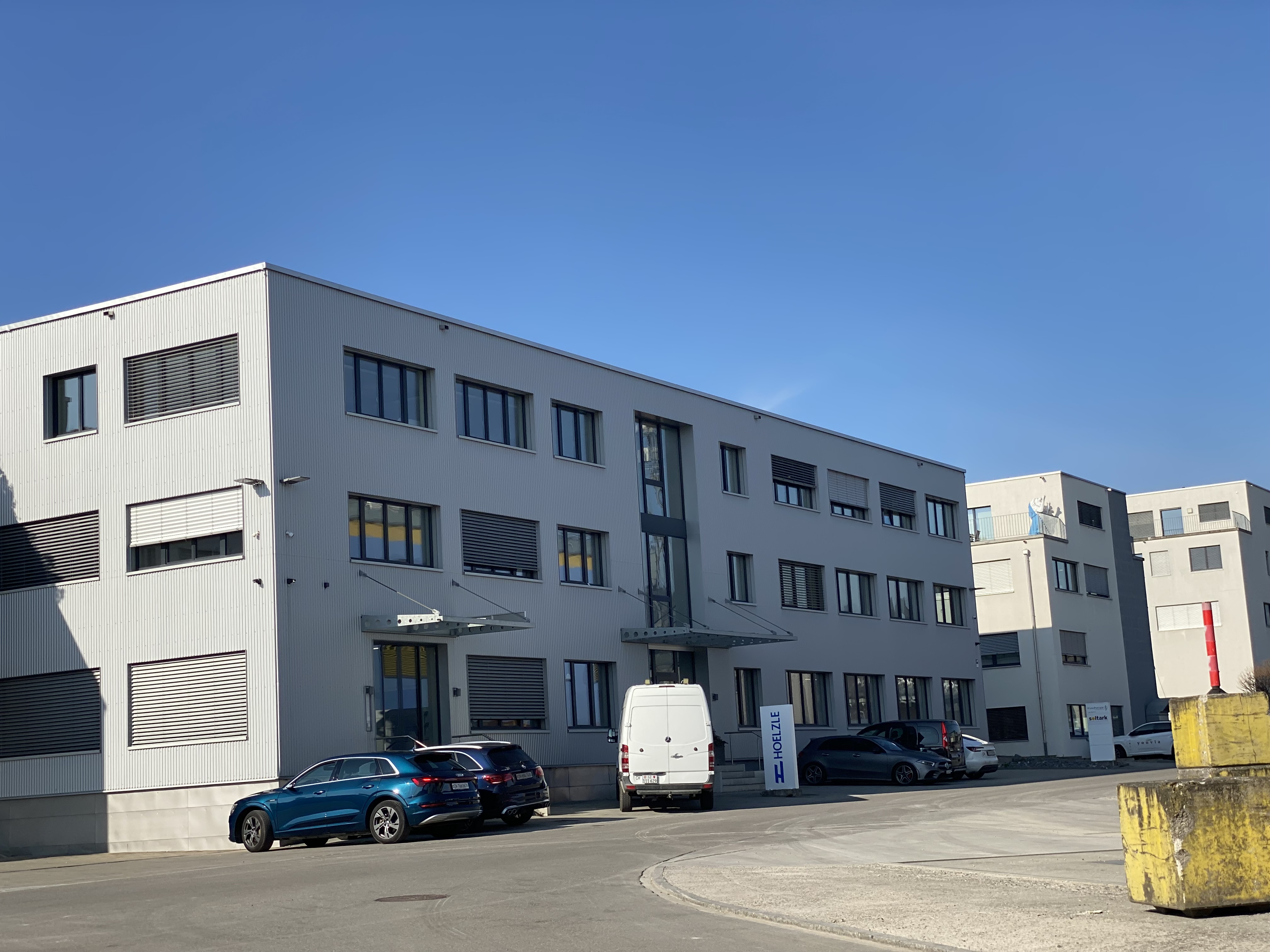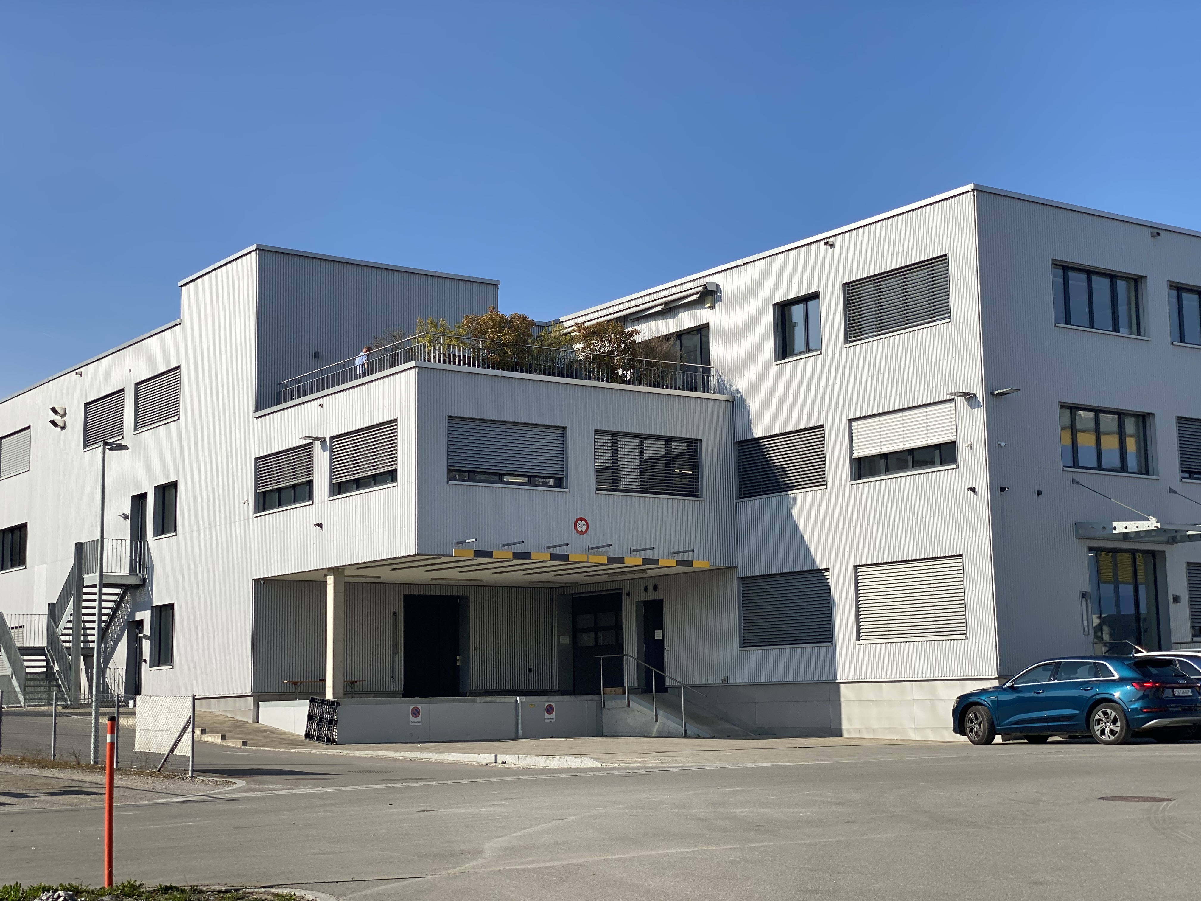 Industriegebäude aus Beton mit hinterlüfteter Fassade und Kunststofffenstern.