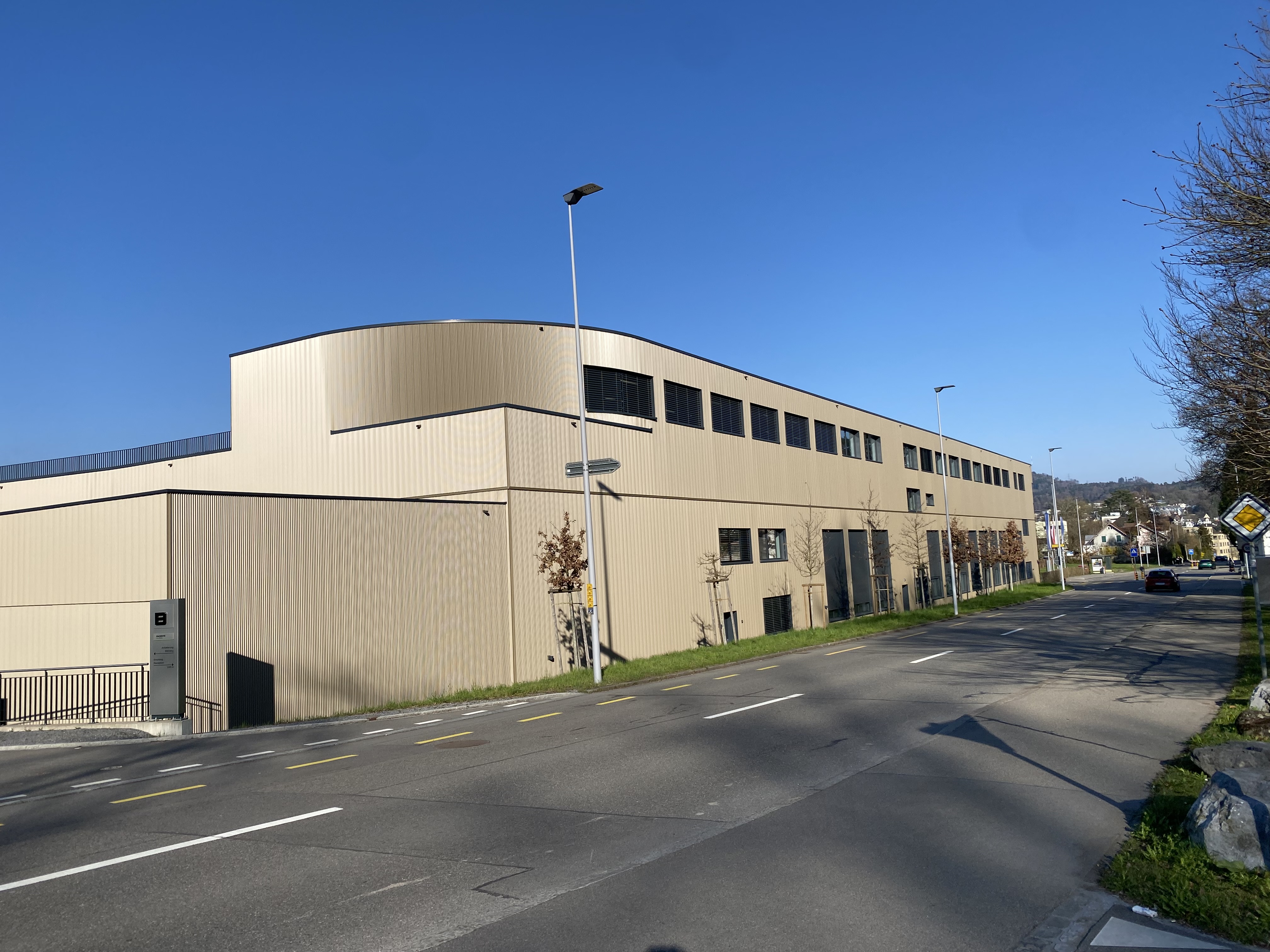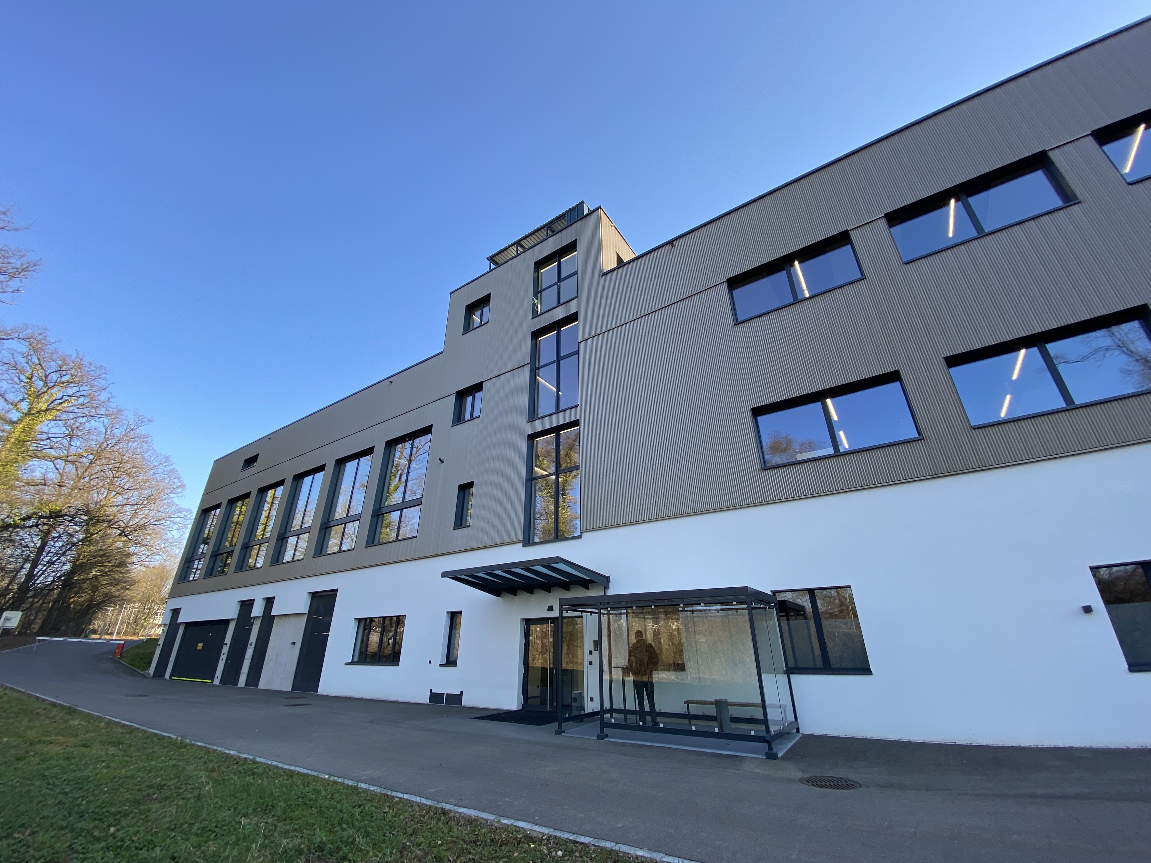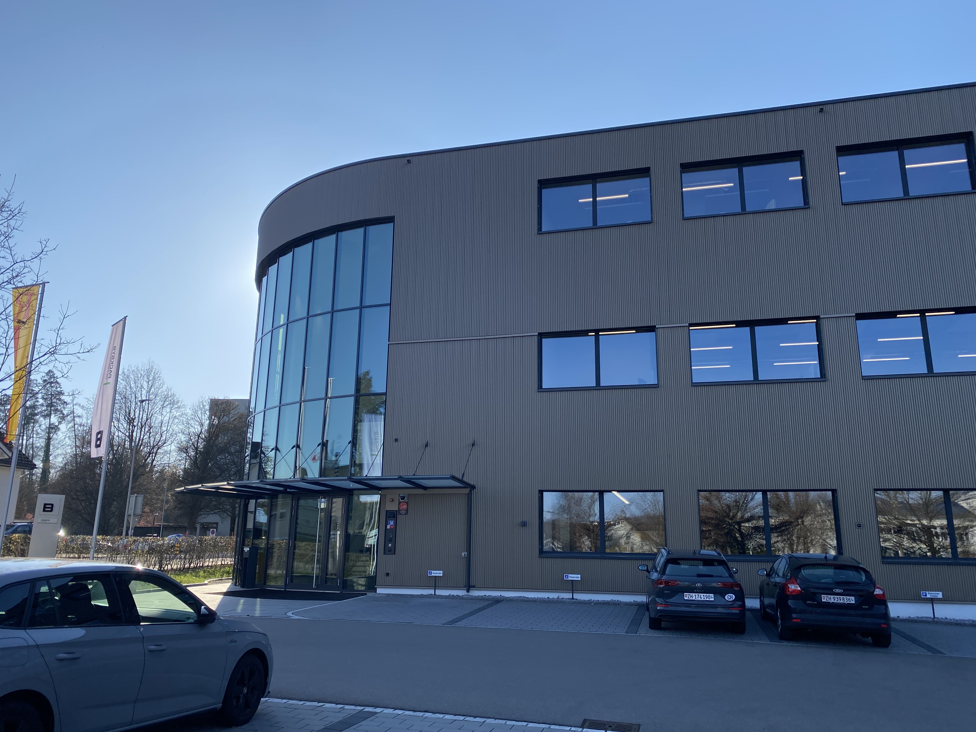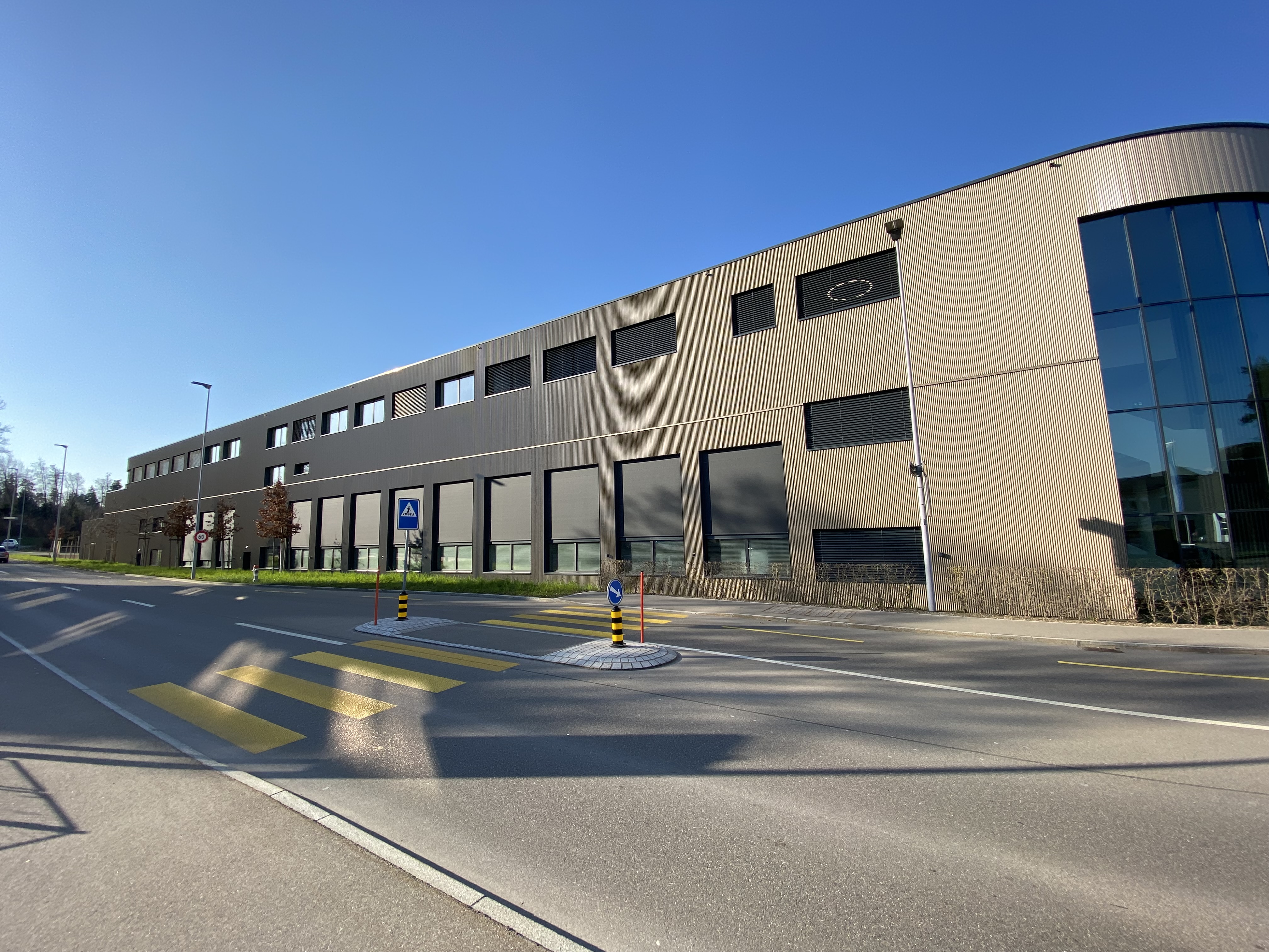 Industriegebäude, Beton mit hinterlüfteter Fassade, Kunststoff-Metallfenster. Runder Eingangsbereich aus Pfostenriegelkonstruktion. Betondecken ab EG im Cobiax-System. Im UG weisse Wanne.