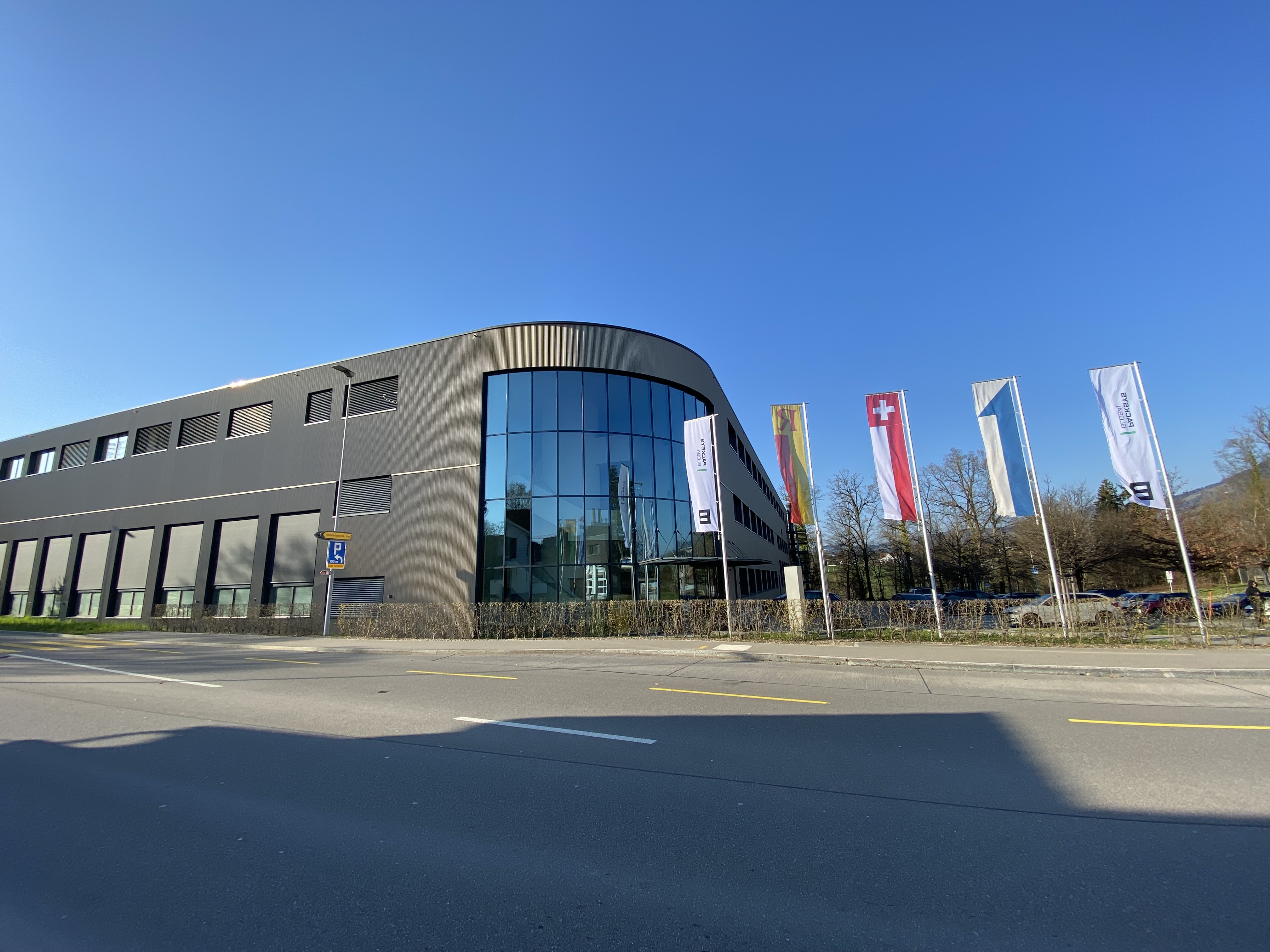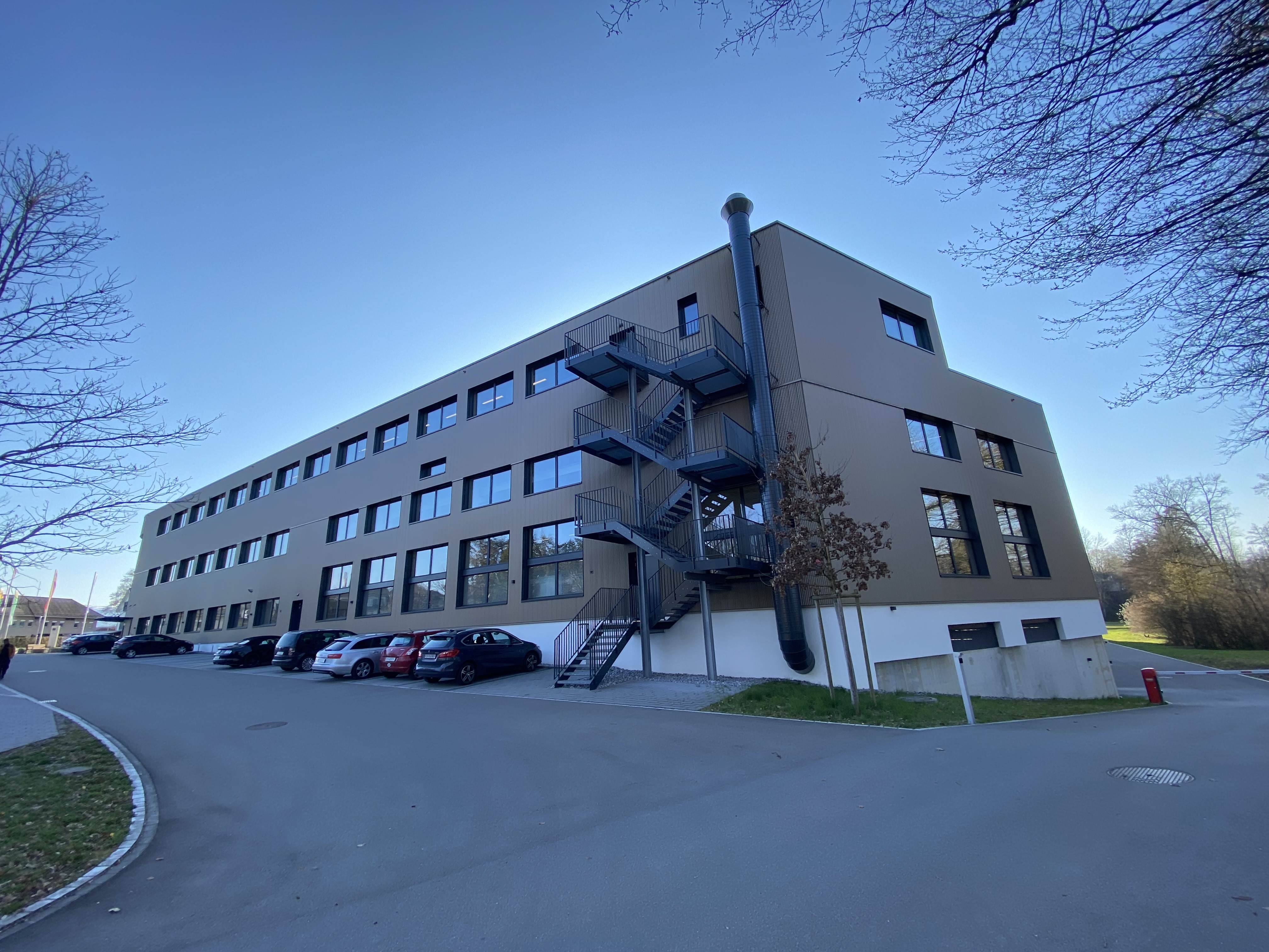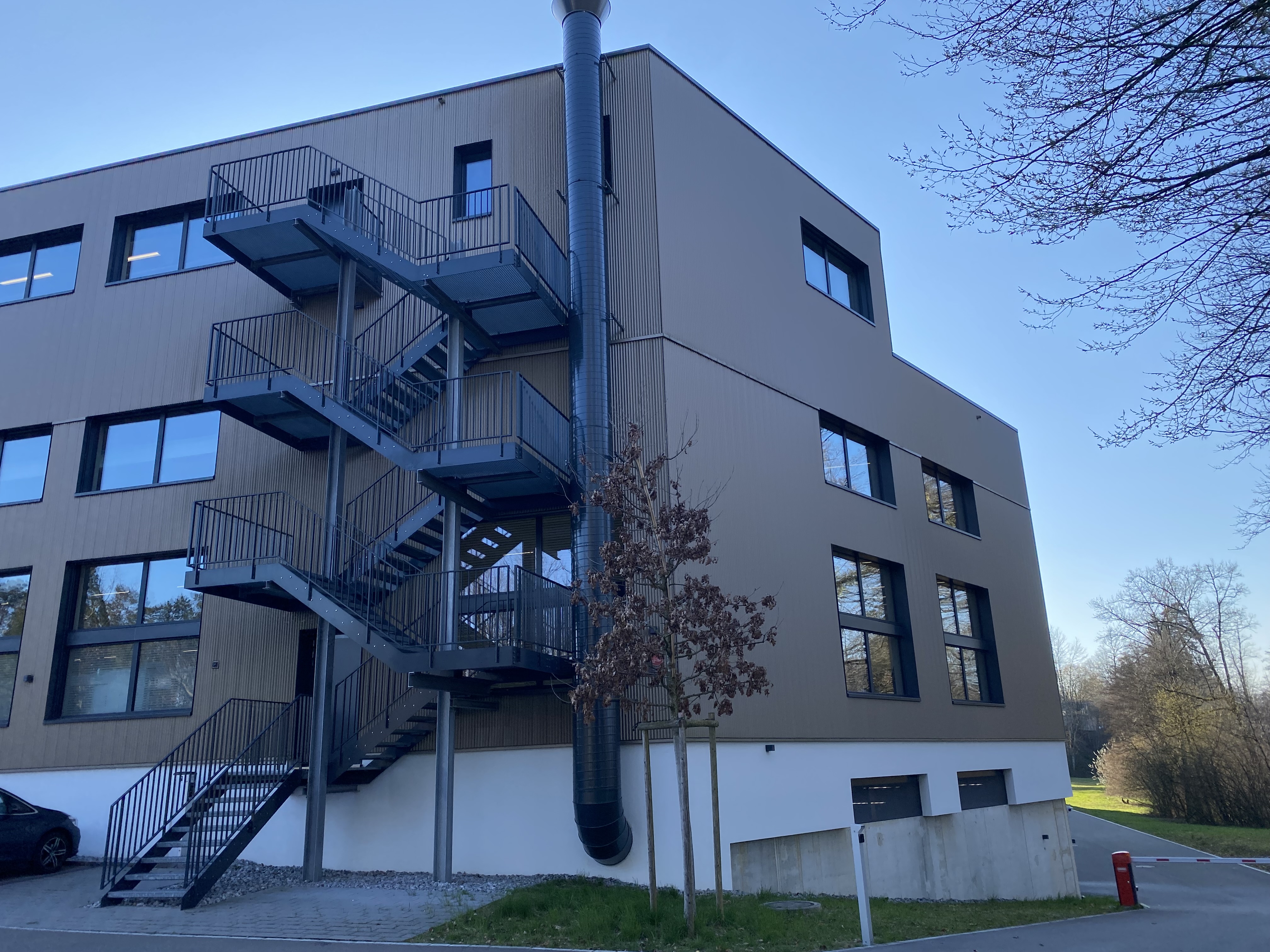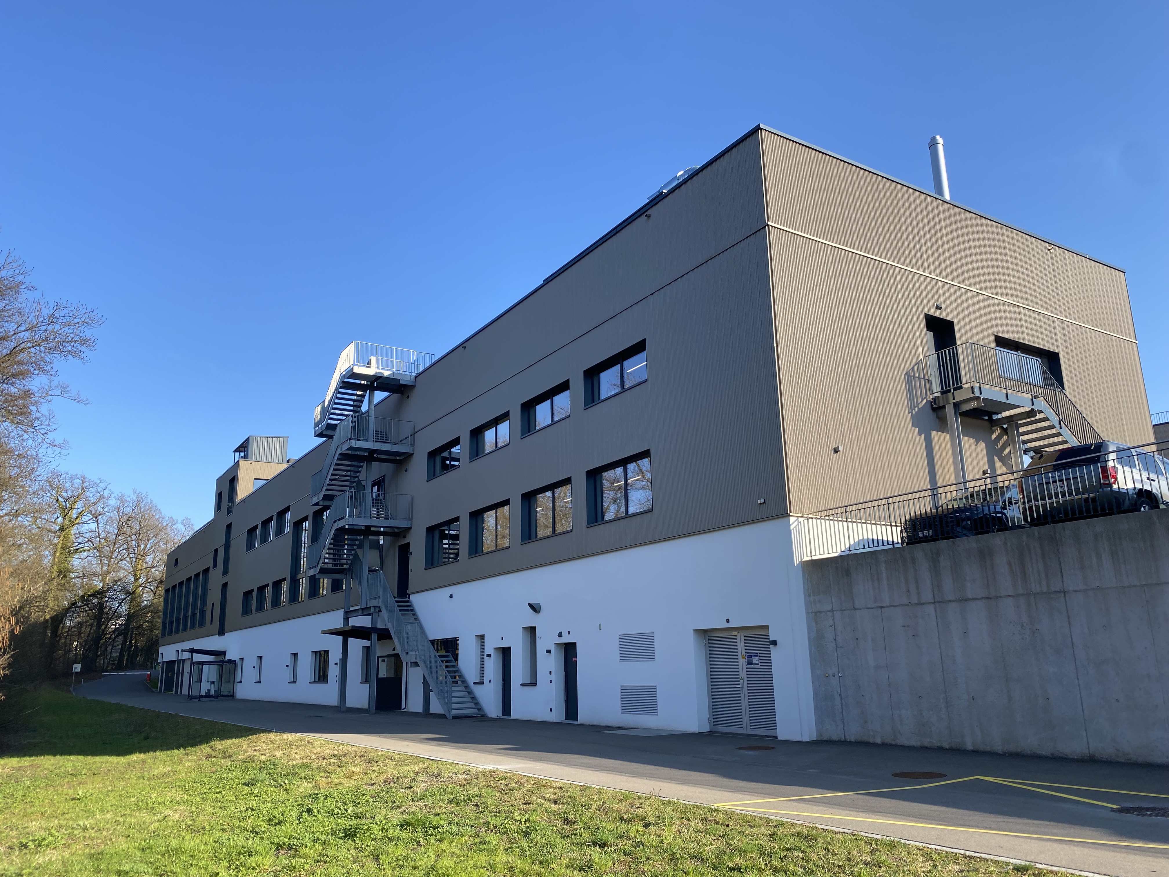 Industriegebäude, Beton mit hinterlüfteter Fassade, Kunststoff-Metallfenster. Runder Eingangsbereich aus Pfostenriegelkonstruktion. Betondecken ab EG im Cobiax-System. Im UG weisse Wanne.