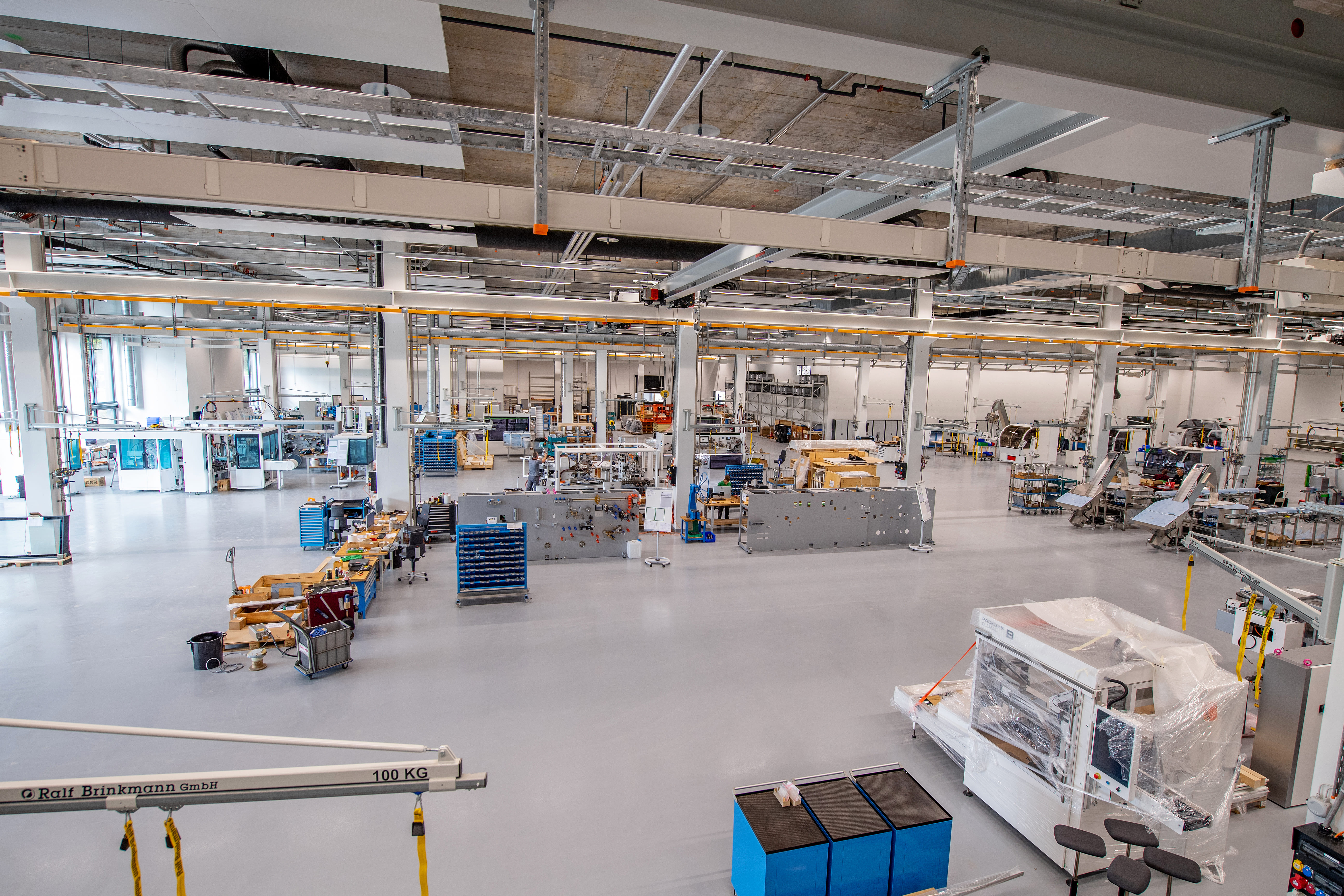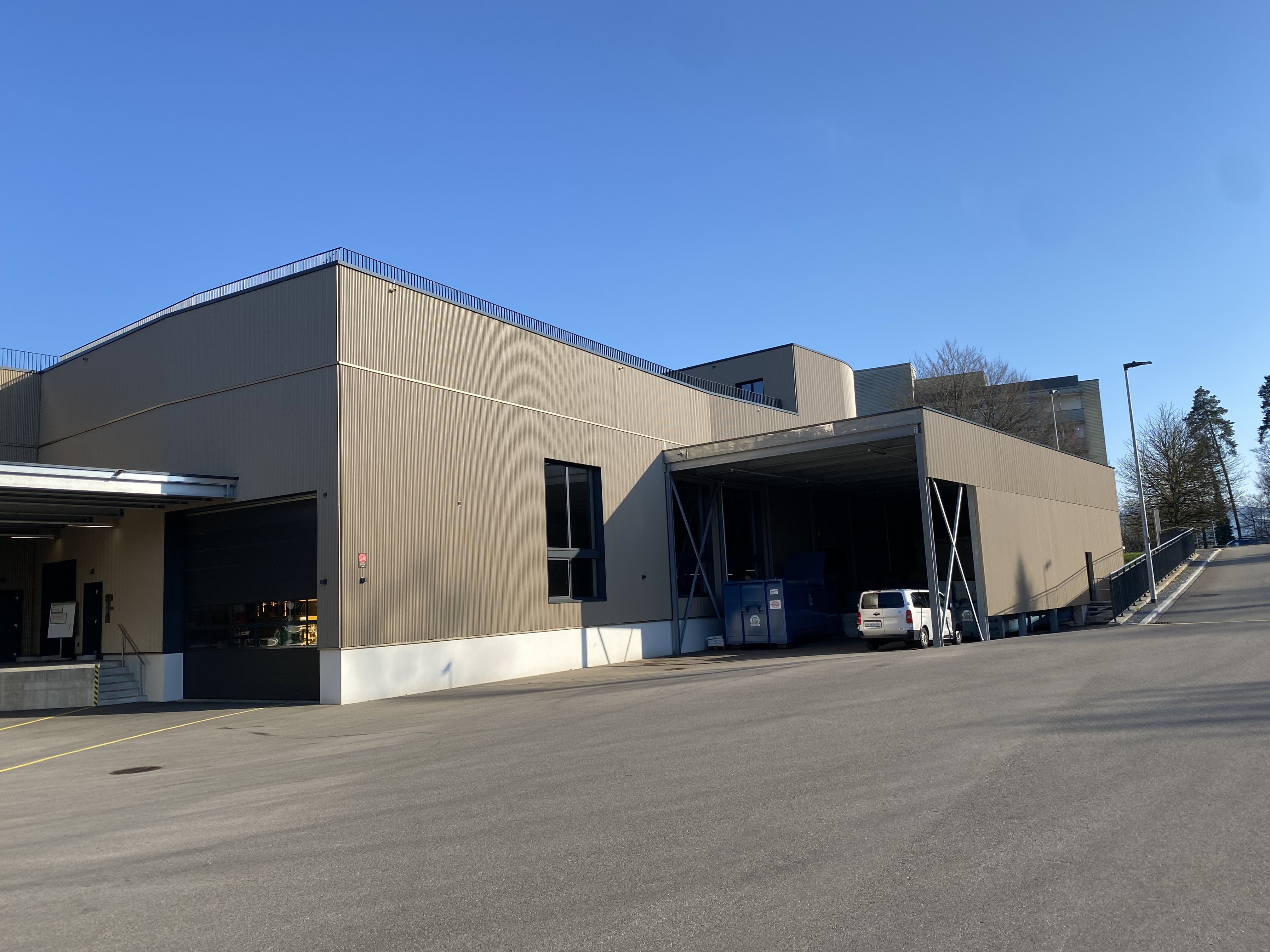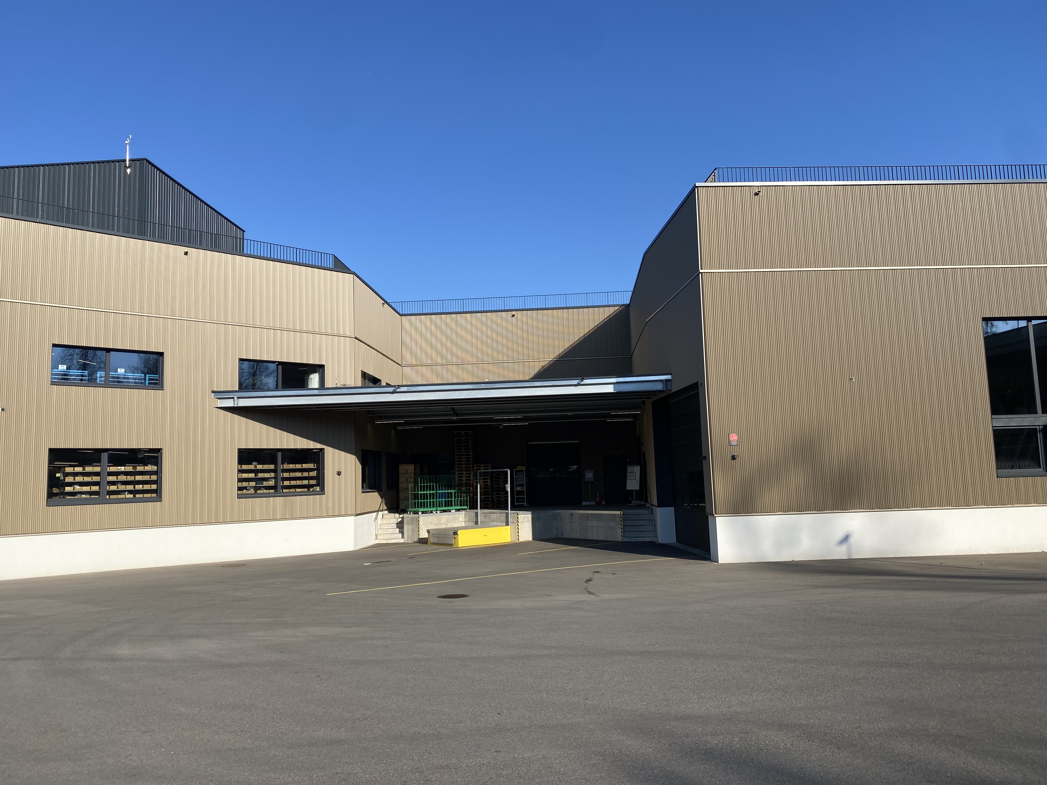 UG, EG, 1. OG und 2. OG. Flachdach mit extensiver Begrünung. 2 Personenlifte, 7 Kranbahnen, Niederspannungsanlage.