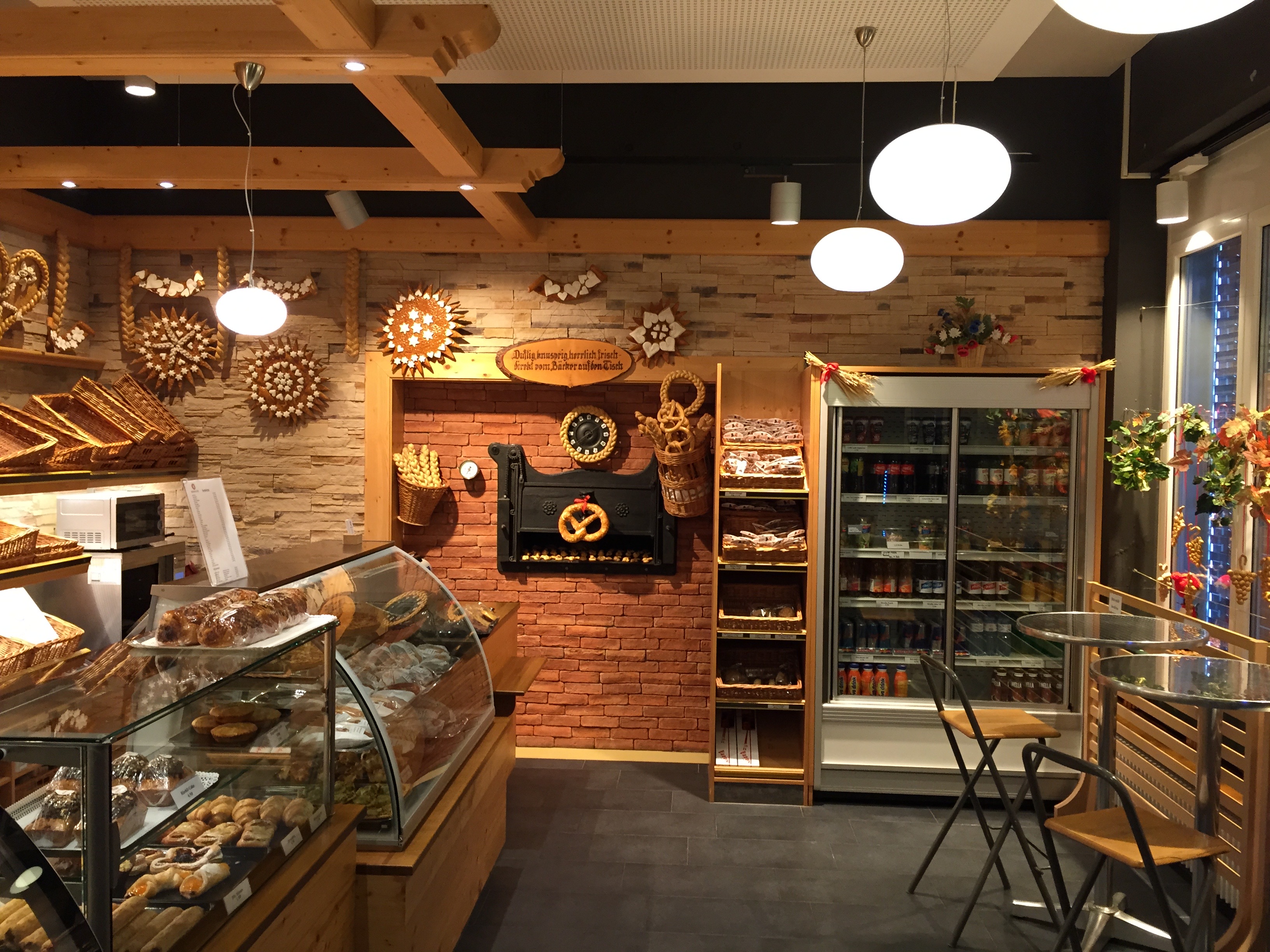 Verkaufsladen mit vier gekühlten Verkaufsvitrinen, für TK-Produkte Tiefkühlschrank, Getränkeautomat, Kasse, Frischgebäckgestell mit LED-Beleuchtung, Kaffeebar, Merrychef.